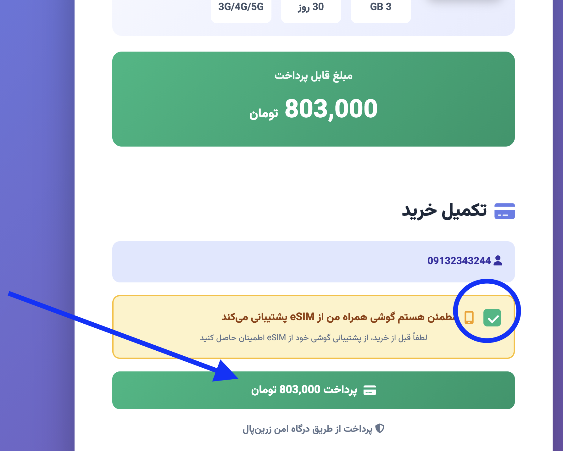 بعد ورود به سایت تایید کن که تلفن همراهت از ایسیم پشتیبانی میکنه و دکمه پرداخت رو بزن