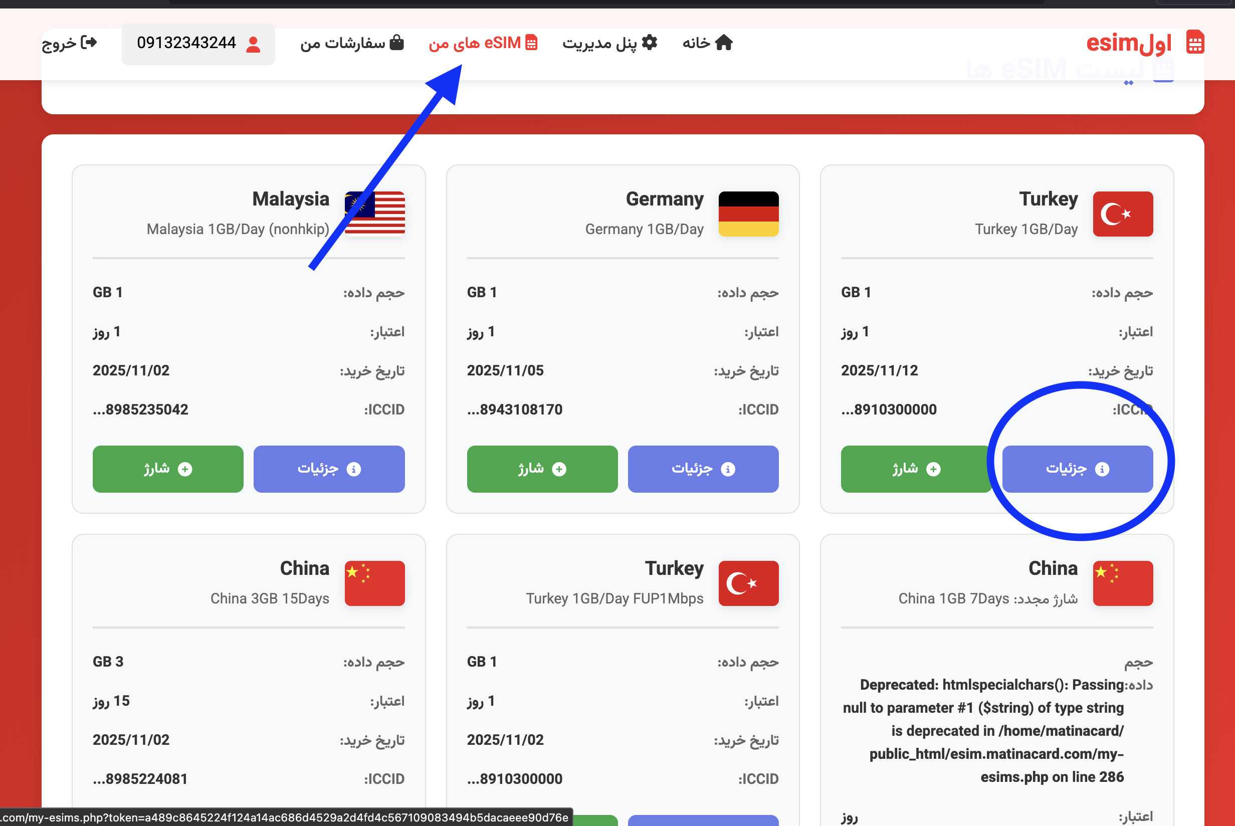 این کد در پنل کاربری در قسمت ایسیم های من قابل مشهاده هست
